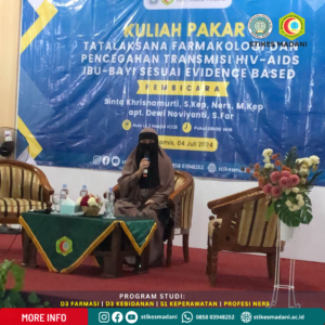 Bantul-Kamis, 4 Juli 2024, STIKes Madani menyelenggarakan Kuliah Pakar dengan topik “Tatalaksana Farmakologi dan Pencegahan Transmisi HIV-AIDS Ibu-Bayi Sesuai Evidence Based”. Acara ini dihadiri oleh seluruh mahasiswa STIKes Madani dan bertujuan untuk meningkatkan pemahaman tentang penanganan dan pencegahan HIV-AIDS, khususnya pada ibu dan bayi.